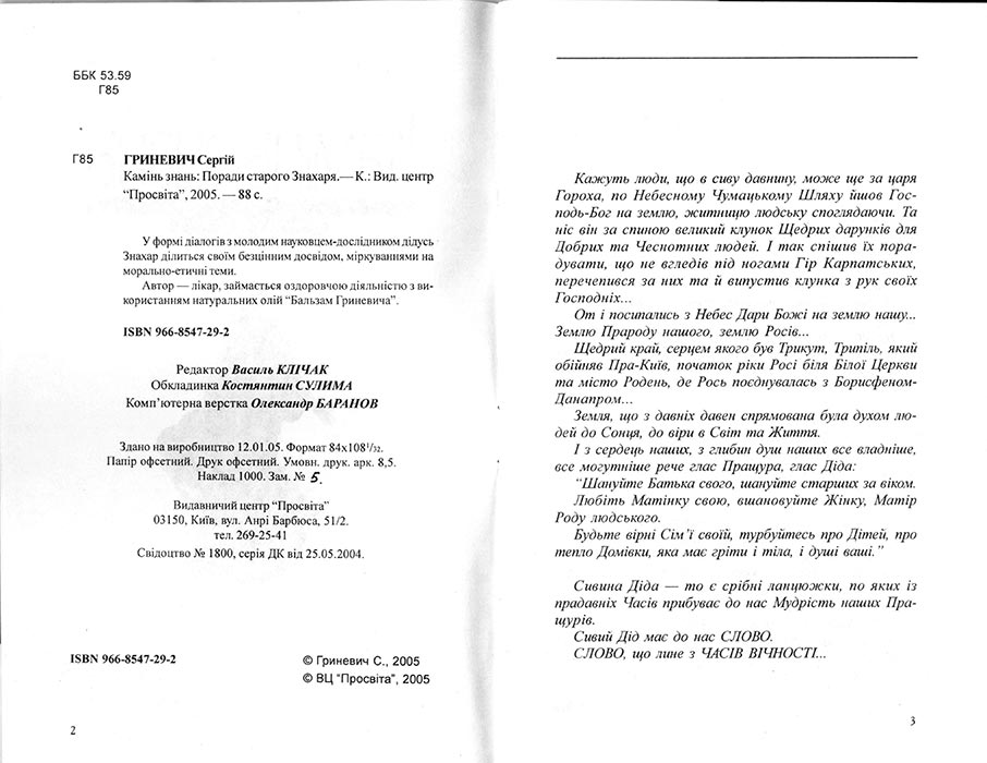 Гриневич Сергій. Камінь знань: Поради старого Знахаря.— К.: Вид. центр “Просвіта”, 2005. — 88 с.