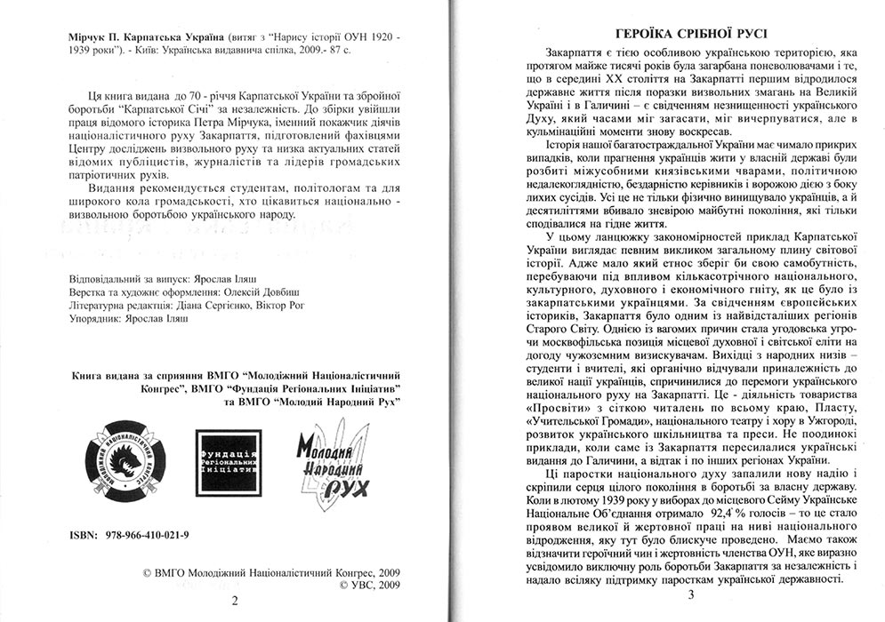 Ця книга видана до 70 - річчя Карпатської України та збройної боротьби “Карпатської Січі” за незалежність. До збірки увійшли праця відомого історика Петра Мірчука, іменний покажчик діячів націоналістичного руху Закарпаття, підготовлений фахівцями Центру досліджень визвольного руху та низка актуальних статей відомих публіцистів, журналістів та лідерів громадських патріотичних рухів.
