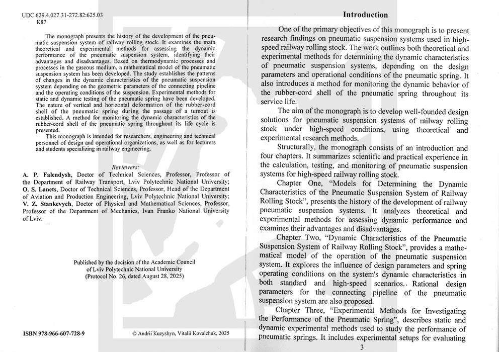 Кузишин Андрій, Ковальчук Віталій. Методи та моделі визначення динамічних показників пневматичної системи ресорного підвішування швидкісного рухомого складу залізничного транспорту: [Монографія] [Текст] / Andrii Kuzyshyn,Vitalii Kovalchuk. - Львів: Каменяр, 2025. - 149 с.: табл., рис. - Англ.